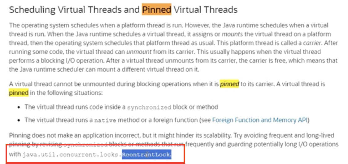 (ReentrantLock 사용 시 pinned virtual thread가 되지 않는다.)
