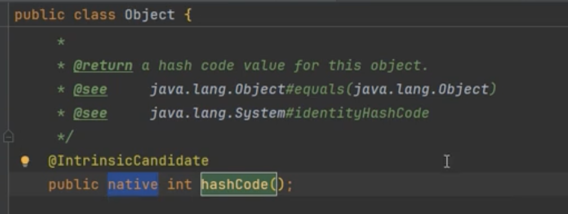 Object 클래스를 보면 hascode 라는 메서드가 있다. 이는 native로 설정이 되어 있으며 body 값이 없다. native 로 적혀져 있는 것은 c, c++ 같은 native 언어로 만들어진 라이브러리에서 실제 body가 실행되는 것이고 java에 선언된 hascode 메서드는 해당 라이브러리 코드 호출을 의미한다.
