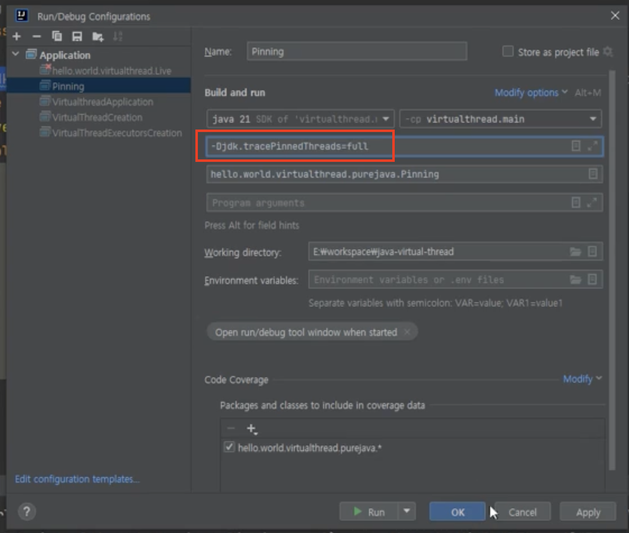 위 옵션을 넣어 실행해보면 어느 지점에 pinned virtual thread가 되었는지 확인할 수 있다.