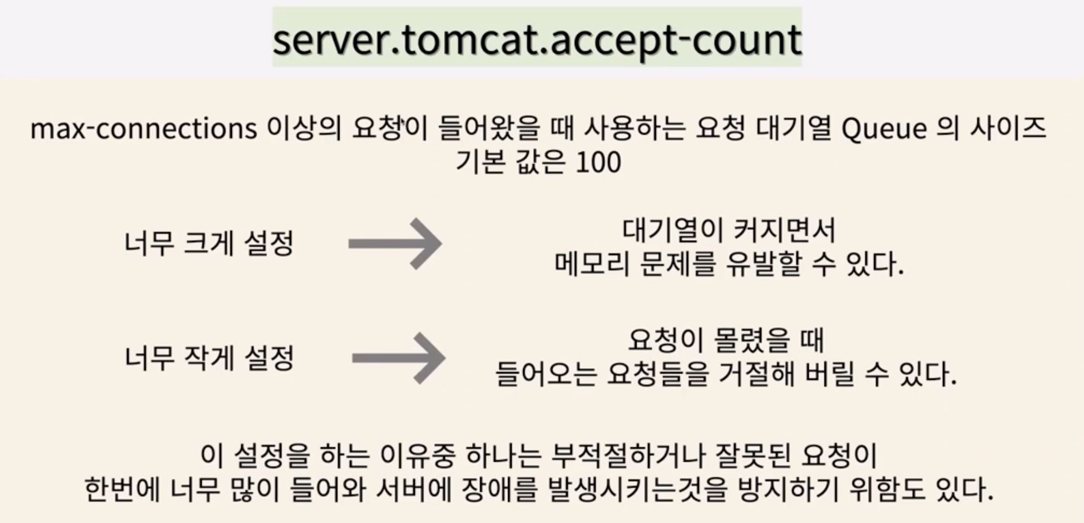 - MaxConnections 와 AcceptCount 이상의 요청이 들어왔을 때 추가적으로 들어오는 요청은 거절될 수 있다.