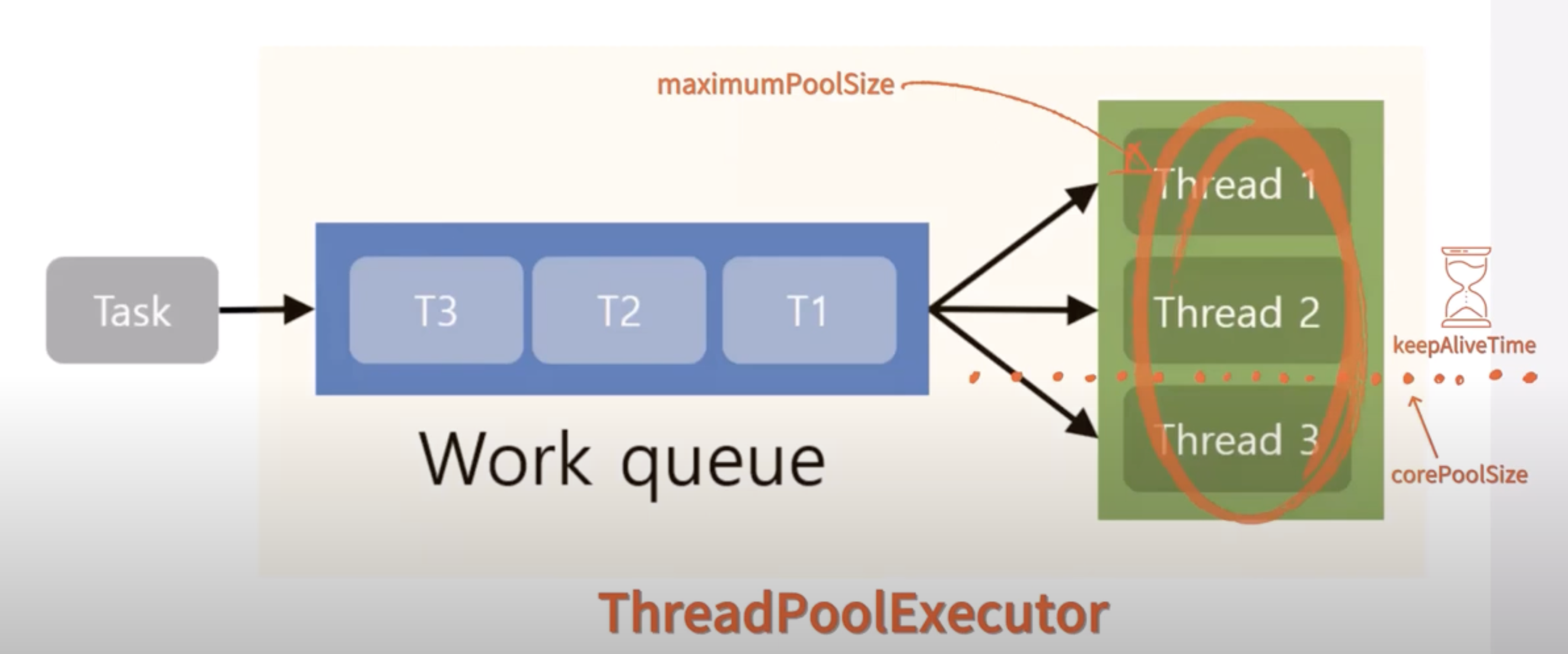 - 최대 maximumPoolSize, 최소 corePoolSize 만큼 가지고 있다.