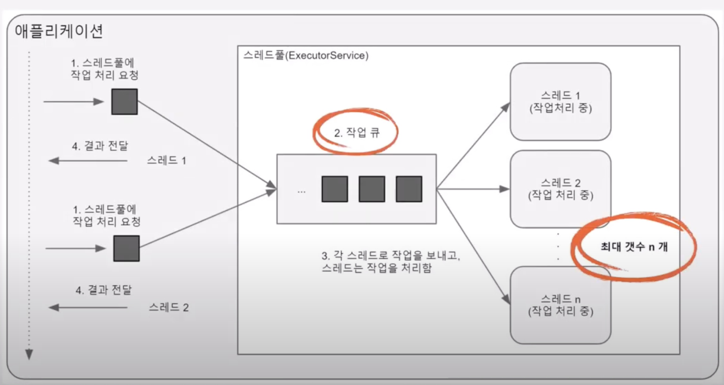 - 스레드 풀에 작업 요청이 들어오면 작업 큐에 작업이 쌓인다.